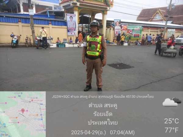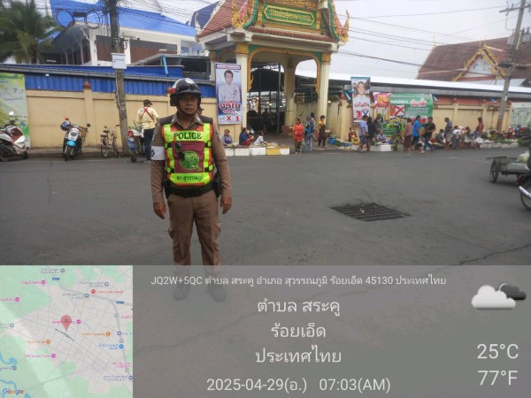 29 เม.ย.2568 เวลา 07.00 น. สภ.สุวรรณภูมิ ภายใต้การอำนวยการของ พ.ต.อ.พงษ์ศักดิ์ เตยหล้า ผกก.สภ.สุวรรณภูมิ พ.ต.ท.ณัฐชัย ผาตากเเดด รองผกก.ป.สภ.สุวรรณภูมิ พ.ต.ท.หนึ่งตะวัน อุปชิตร สวป.สภ.สุวรรณภูมิ ได้สั่งการให้ ร.ต.อ.ประเสริฐ ศรีฮาดรองสวป.สภ.สุวรรณภูมิ ร.ต.อ.ศุกลวัฒน์ อ่อนคำ รองสวป.สภ.สุวรรณภูมิ พร้อมชุดจราจรเวร ออกปฏิบัติหน้าที่อำนวยความสะดวกการจราจร หน้าวัดเหนือ กวดขันวินัยจราจร ห้ามวางสินค้าสิ่งกีดขวางการจราจร พร้อมได้ออกตรวจเยีมมประชาชนในระบบPOLICE 4.0 จำนวน5 ราย การจราจรคล่องตัว เหตุการณ์ทั่วไปปกติ
