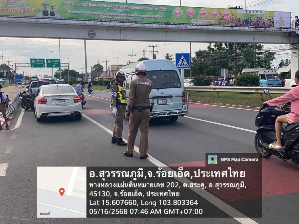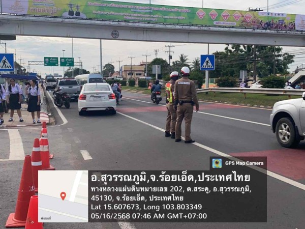 16 พ.ค.2568 เวลา 07.30 น. ร.ต.อ.อรรถพล ทองไพร รอง สวป.สภ.สุวรรณภูมิ ปฏิบัติหน้าที่ร้อยเวรจราจร อำนวยความสะดวกการจราจร หน้าโรงเรียนสุวรรณภูมิพิทยไพศาล เปิดภาคเรียน 2568 การจราจรคล่องตัว เหตุการณ์ปกติ