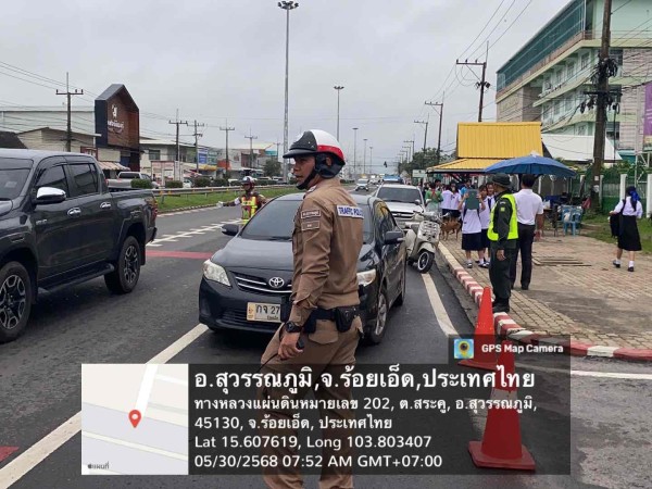 30 พ.ค.2568 เวลา 07.30 น. ร.ต.อ.อรรถพล ทองไพร รอง สวป.สภ.สุวรรณภูมิ ปฏิบัติหน้าที่ร้อยเวรจราจร อำนวยความสะดวกการจราจร หน้าโรงเรียนสุวรรณภูมิพิทยไพศาล การจราจรคล่องตัว เหตุการณ์ปกติ