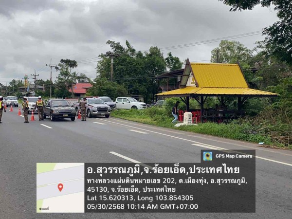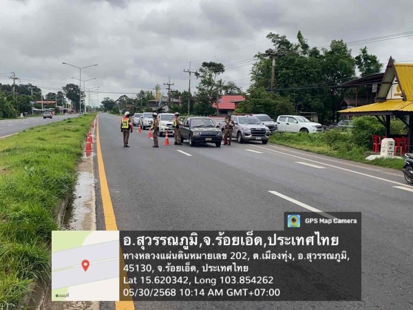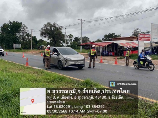 30 พ.ค.2568 เวลา 09.45 น. ภายใต้อำนวยการโดย พ.ต.อ.พงษ์ศักดิ์ เตยหล้า ผกก.สภ.สุวรรณภูมิ พ.ต.ท.ณัฐชัย ผาตากเเดด รอง ผกก.ป.สภ.สุวรรณภูมิ ขอรายงานการตั้งจุดตรวจฯ ดังนี้