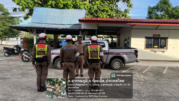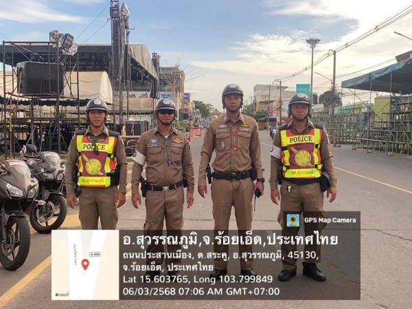 3 มิ.ย.2568 เวลา 07.00 น. ร.ต.อ.อรรถพล ทองไพร รอง สวป.สภ.สุวรรณภูมิ ปฏิบัติหน้าที่ร้อยเวรจราจร พร้อมกำลังเจ้าหน้าที่ตำรวจจราจร อำนวยความสะดวกการจราจร รอบอนุเสาวรีย์ท้าวเซียง เพื่อซักซ้อมขบวนแห่ถ้วยพระราชทานบุญบั้งไฟสุวรรณภูมิ เหตุการณ์ปกติ