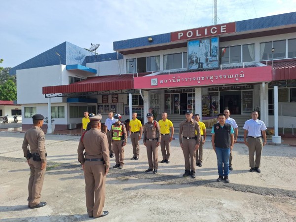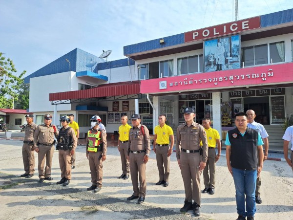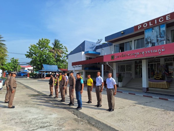 5 มิ.ย.2568 เวลา 08.00 น. ร.ต.อ.ธราธิป วิจารณ์ รอง สว.(สอบสวน)สภ.สุวรรณภูมิ พนักงานสอบสวนเวร พร้อมด้วยร้อยเวรปราบปราม ได้เรียกแถวชุดเวรบูรณาการประจำวัน สิบเวร สายตรวจ สืบสวน จราจร ตรวจความพร้อมการแต่งกาย อุปกรณ์การปฏิบัติหน้าที่ กำชับให้มีความพร้อมในการปฏิบัติตลอดเวลา ทำงานเป็นทีม ใช้ยุทธวิธีที่มีความเหมาะสมในการระงับเหตุ โดยเน้นให้ผู้ปฏิบัติหน้าที่บน สภ.ฯ ให้เตรียมความพร้อมหากมีเหตุการณ์เกิดขึ้นที่ตั้งหน่วย มอบหมายภารกิจ เสร็จแล้วจึงได้ปล่อยแถวออกปฏิบัติหน้าที่ต่อไป