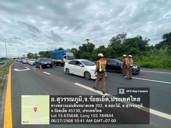 27 มิ.ย.2568 เวลา 09.30 น. ภายใต้อำนวยการโดย พ.ต.อ.พงษ์ศักดิ์ เตยหล้า ผกก.สภ.สุวรรณภูมิ พ.ต.ท.ณัฐชัย ผาตากเเดด รอง ผกก.ป.ฯ ขอรายงานการตั้งจุดตรวจฯดังนี้