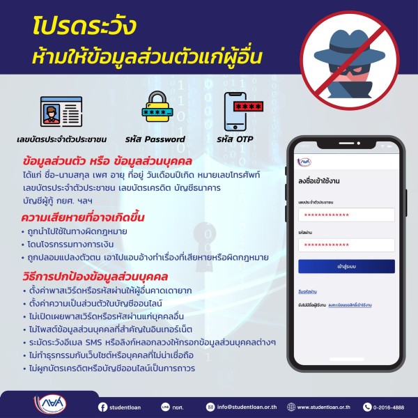 กองทุนเงินให้กู้ยืมเพื่อการศึกษา แจ้งโปรดระวังห้ามให้ข้อมูลส่วนตัวแก่ผู้อื่น
