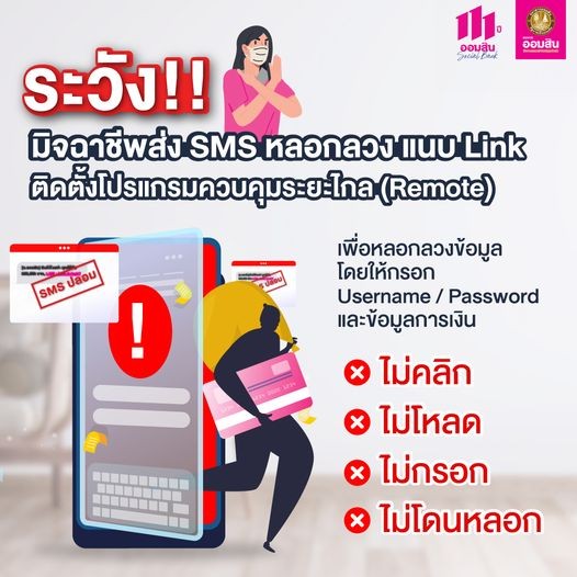 ธนาคารออมสิน แจ้งระวังมิจฉาชีพส่ง SMS แนบ Link ติดตั้งโปรแกรมควบคุมระยะไกล (Remote)