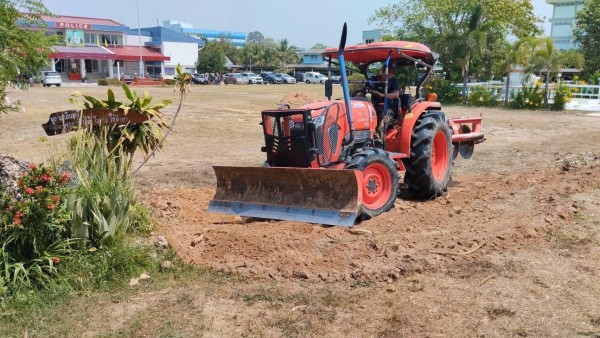 ประสานรถไถมาปรับภูมิทัศน์ บริเวณสนามหญ้าด้านหน้า สภ.สุวรรณภูมิ